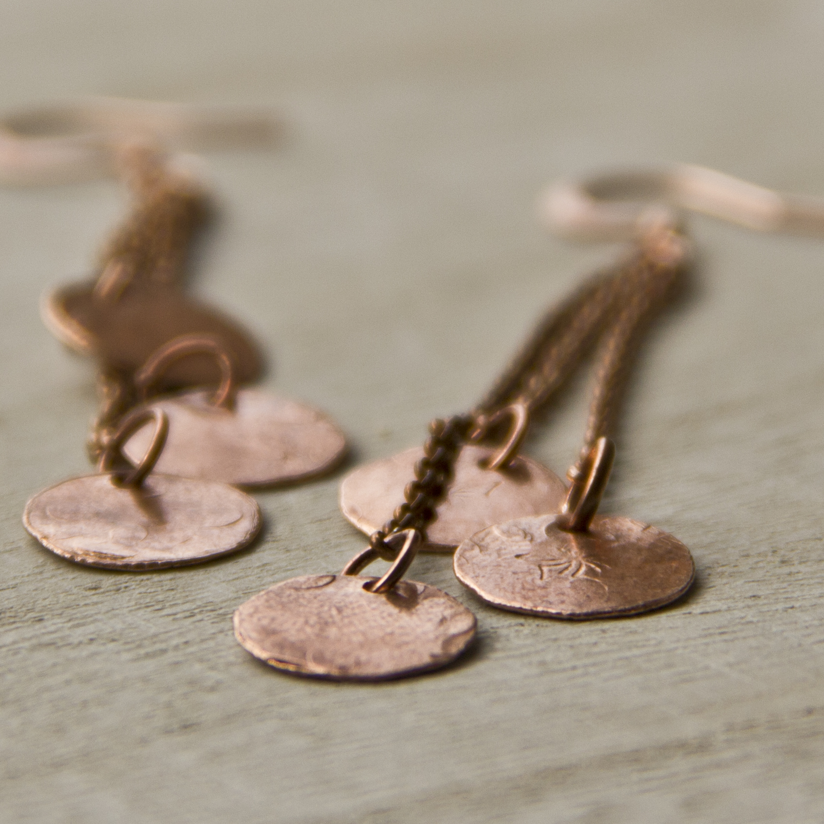 Pretty and simple copper earrings feature 3 small copper discs which have been gently hammered to give a subtle texture. Each disc is attached to a fine copper chain, each of a slightly different length, and hung from a copper ear wire. These earrings were designed to match the Sundrops Long Copper Necklace, also available from my shop.