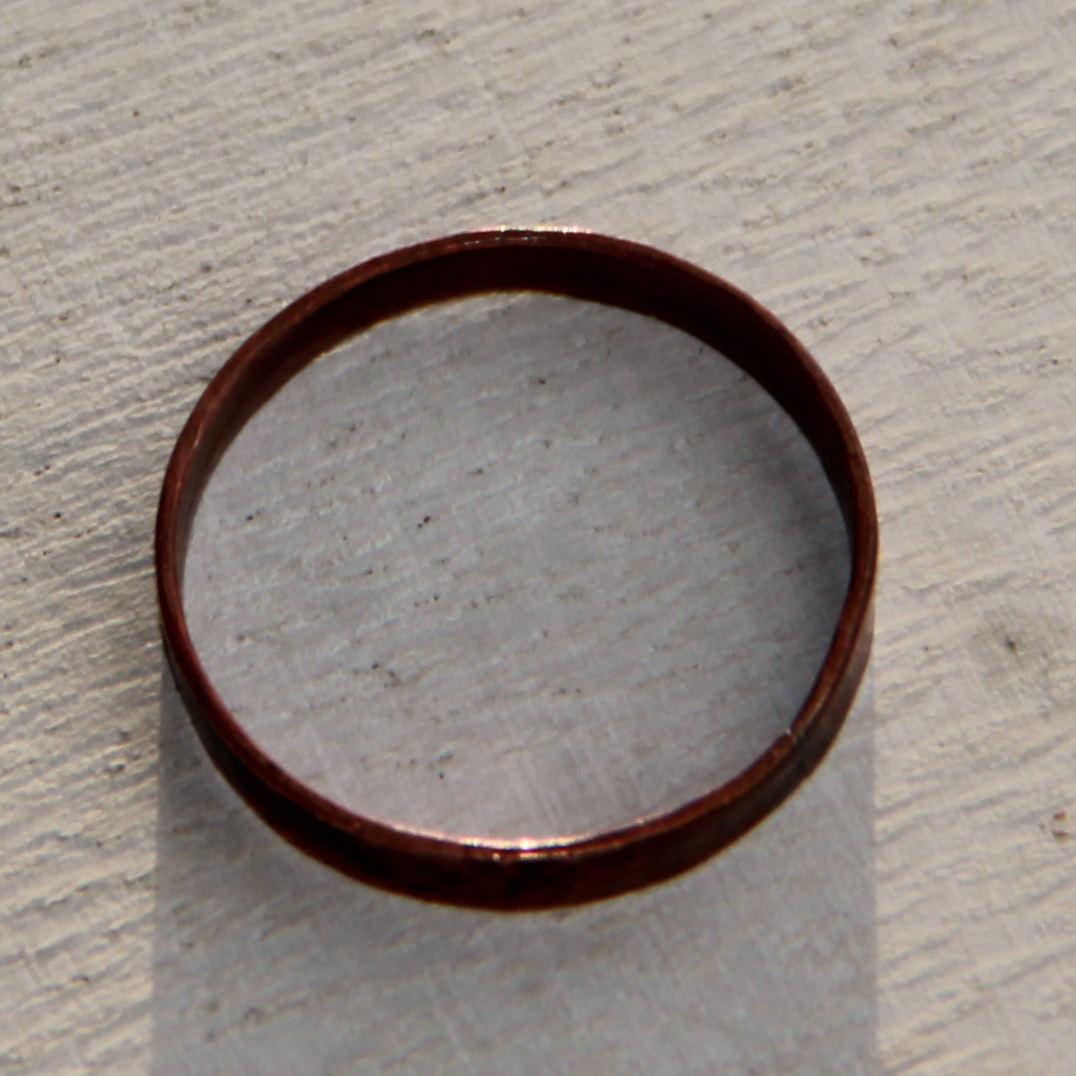 This simple ring features a narrow strip of copper, shaped and soldered into a ring. After soldering the ring is carefully hammered to toughen the shape and provide a rustic texture. Finally the ring is polished smooth which highlights the texture but does not remove the dark patina from soldering. This ring is equally popular with both men and women.