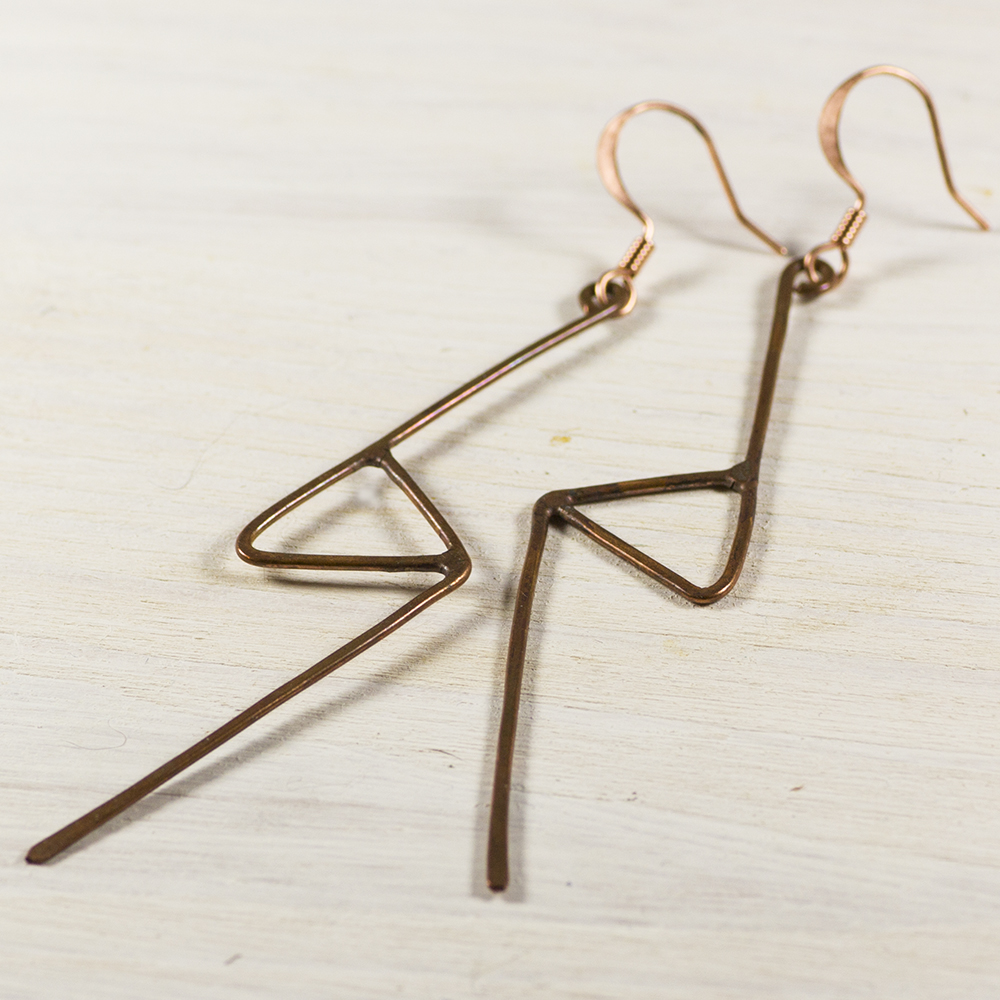 A simple design of 2 bent wires soldered together to create a zig zag shape and hammered for a rustic texture.