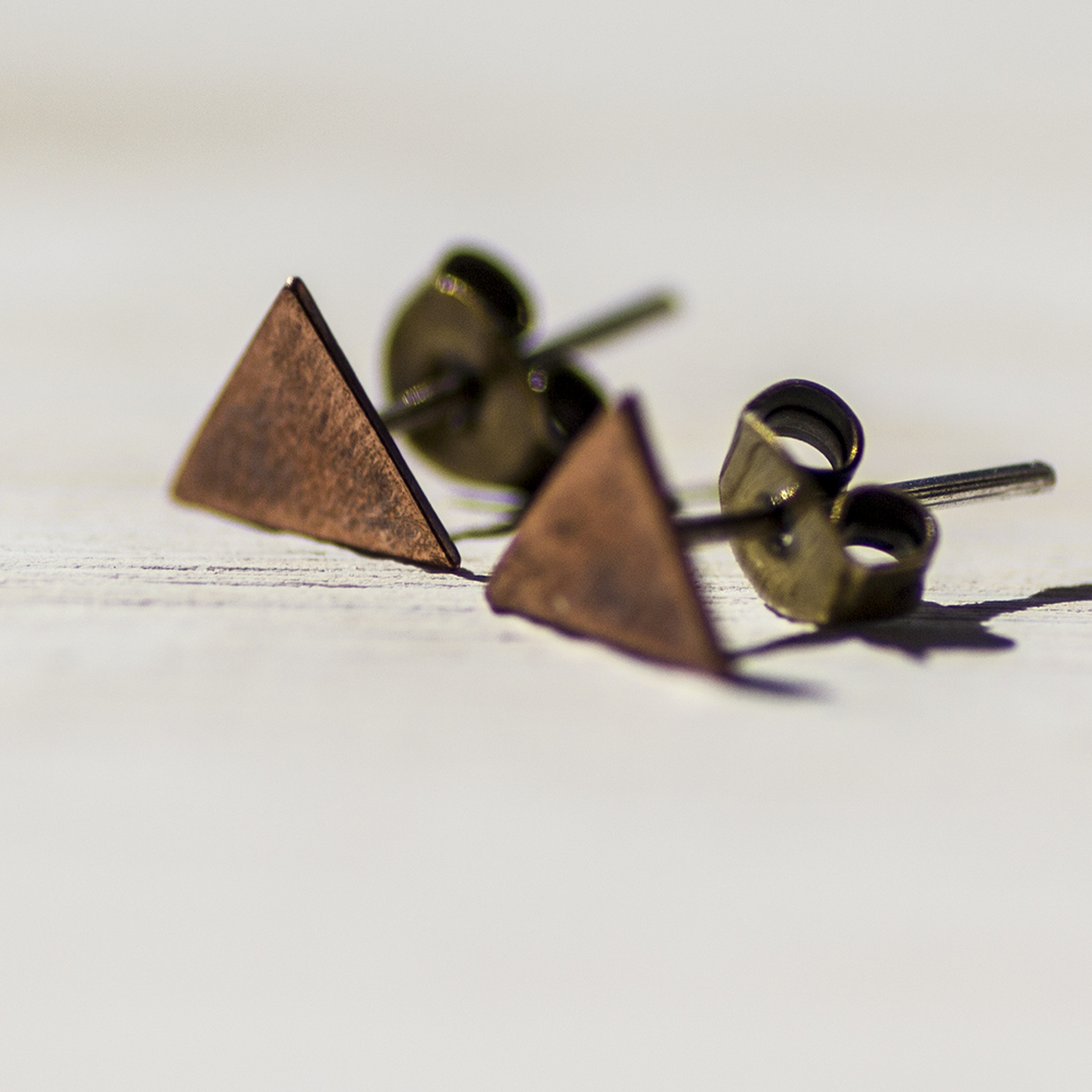 These simple, triangle stud earrings have a dark patina from the soldering process. Each tiny copper triangle is hand cut from copper sheet and then soldered onto a silver-filled post. They are adorable on their own or the perfect earrings for a 2nd piercing, especially with copper dangles in your 1st.