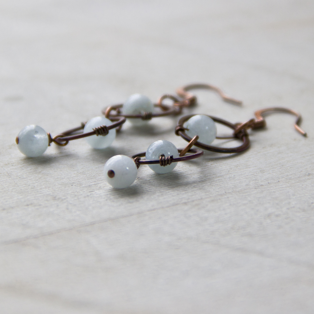 These bubbly earrings are made from a series of handmade copper circles, hammered and oxidised to a rustic patina. Finer copper wire secures a single milky Aquamarine or Rose Quartz bead, cutting across the centre of each circle, and is attached on each side with a delicate wire wrap. A final bead dangles elegantly from the bottom loop.